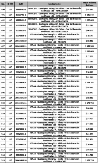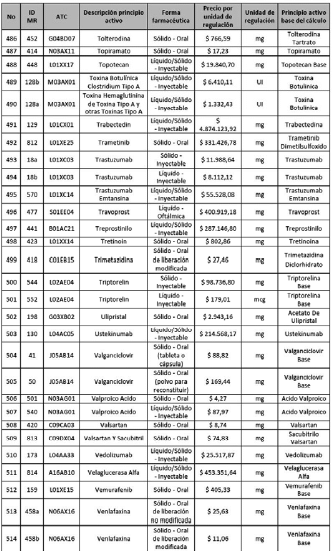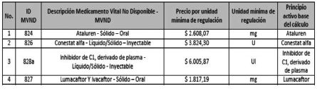 ARTÍCULO 4o. PRECIO POR UNIDAD DE REGULACIÓN DE MEDICAMENTOS VITALES NO DISPONIBLES. <Circular derogada por la Circular 13 de 2022. Surte efecto a partir del 26 de septiembre de 2022> El Precio Máximo de Venta por unidad de regulación de los siguientes Medicamentos Vitales No Disponibles para las operaciones realizadas con recursos asignados a la salud, es el siguiente: