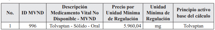 ARTÍCULO 6o. PRECIO POR UNIDAD DE REGULACIÓN DE MEDICAMENTOS VITALES NO DISPONIBLES. <Circular derogada por la Circular 19 de 2024> El Precio Máximo de Venta por unidad de regulación de los siguientes Medicamentos Vitales No Disponibles para las operaciones realizadas con recursos asignados a la salud, es el siguiente: