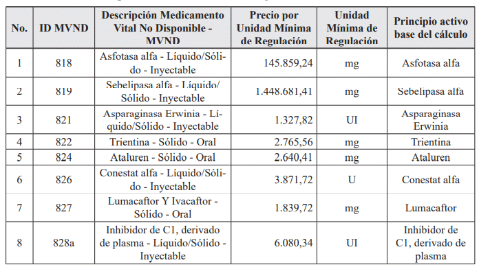 Por la cual se establece el listado de los medicamentos sujetos al régimen de control directo de precios, se fija el precio máximo de venta y el precio por unidad de regulación de Medicamentos Vitales No Disponibles y se dictan otras disposiciones.