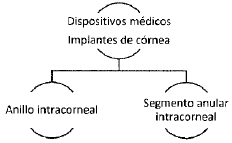 3.1. Anillo intracorneal: banda circular implantable y abierta en un extremo, para aplanar la curvatura anterior de la córnea sin afectar al eje visual, a fin de corregir la miopía leve o moderada. Se inserta en la córnea a través de un canal intraestromal creado con un bisturí de diamante o láser. Es de plástico y tiene un diámetro externo e interno de aproximadamente 8 y 6,8 mm, respectivamente.