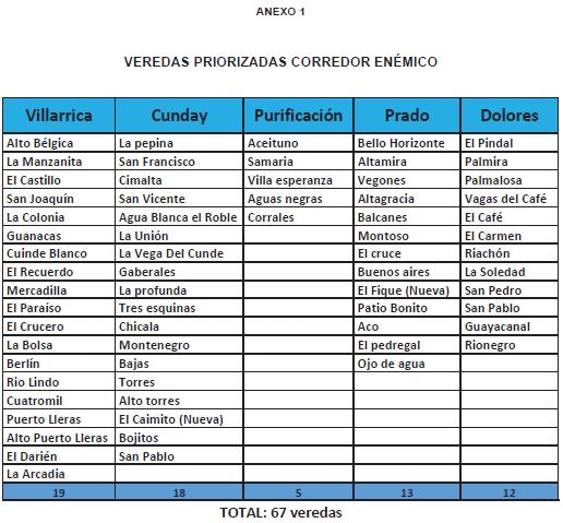 A la fecha, el corredor endémico está conformado por 67 veredas (situación dinámica) de los municipios de Cunday, Dolores, Prado, Purificación y Villarrica y se ampliará a las veredas donde se presenten casos o epizootias y a las veredas colindantes, en estos municipios u otros.