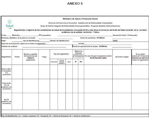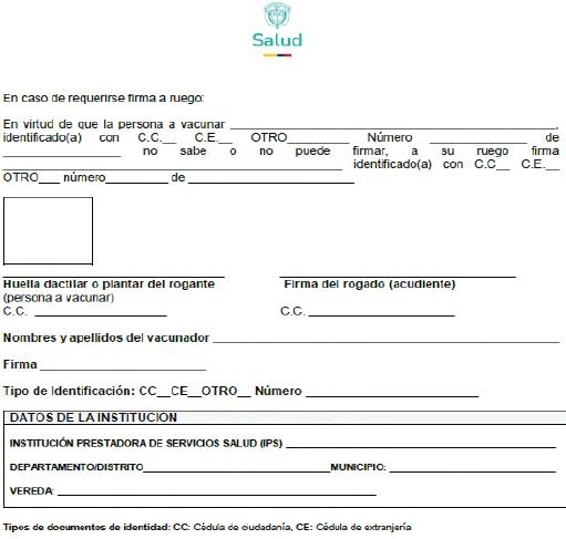 2.3.1.2.8. Garantizar a través de las IPS la disposición de copias físicas para el diligenciamiento de los formatos anexos a la presente circular, por parte de los profesionales de la salud de las IPS (médico, enfermera), requisito obligatorio previo a la vacunación de la población de 60 y más años, los cuales son: “Consentimiento informado para la aplicación de la vacuna contra la fiebre amarilla en población de 60 y más años en el corredor endémico por brote de FA del Tolima”, “Encuesta previa a la vacunación en brote de fiebre amarilla para la población de 60 y más años del corredor endémico del Tolima” y “Formato de rechazo a la vacunación contra la fiebre amarilla en población de 60 y más años expuesta a brote en la ET Tolima”. La socialización y capacitación de los mencionados formatos estará a cargo de las ET y son de uso exclusivo para el departamento del Tolima.