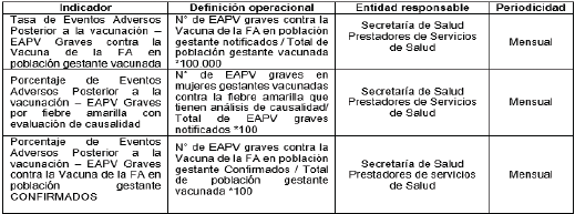 Para poder identificar tempranamente eventos de interés durante la gestación, se deberá asegurar un seguimiento post vacunación que permita la generación de información sobre la seguridad de la vacuna hasta el parto y del recién nacido hasta un mes posparto. Esto en coherencia con el protocolo que defina el INVIMA para tal fin. También se tendrá precaución para generar mensajes que expliquen muy bien cuáles son las situaciones que llevarían a considerar la vacunación de gestantes, aclarando que no corresponde a una recomendación para vacunación masiva en esta población, sino a la población con muy alto riesgo de fiebre amarilla según los criterios de circulación activa del virus mencionado previamente.