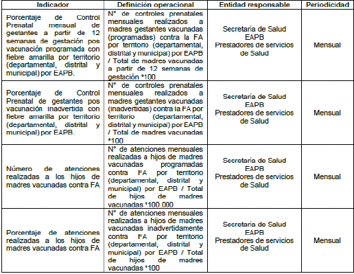Las EPS e IPS deben implementar un seguimiento clínico periódico a las gestantes vacunadas, desde la aplicación de la vacuna hasta el posparto, incluyendo la vigilancia de sospecha de eventos adversos asociados, y reporte al INS y al INVIMA. Se debe establecer una vigilancia activa del neonato hijo de mujeres vacunadas durante el embarazo o la lactancia sobre la detección de posibles eventos adversos asociados a la vacuna de fiebre amarilla.