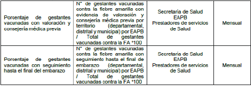 1.4 Los departamentos y distritos con veredas de circulación activa del virus de la fiebre amarilla, deben remitir informe que contenga el monitoreo de los indicadores establecidos en la presente circular y el desarrollo cuantificado de las actividades establecidas en el Plan de Acción de vacunación de la población gestante, a las siguientes áreas del MSPS: 1. Dirección de Promoción y Prevención, Subdirección de Enfermedades Transmisibles, Grupo Gestión Integrada de Enfermedades Inmunoprevenibles (PAI), 2. Dirección de Prestación de Servicios y Atención Primaria 3. Dirección de Regulación de la Operación del Aseguramiento en Salud, Riesgos Laborales y Pensiones, en los primeros diez (10) días hábiles de cada mes.