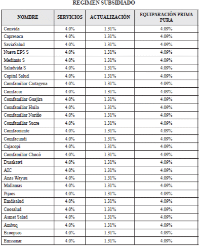 - Régimen Subsidiado. Para la vigencia 2019 se fijó el incremento de la UPC en 9.40%. El porcentaje de este incremento para recuperar y mantener el valor adquisitivo de la Unidad de Pago por Capitación (UPC) es de 4.0%, el cual corresponde a los servicios que se venían prestando, por equiparación primas puras de 4.09% en acatamiento a lo ordenado en el Auto 411 de 2016 de la Sala de Seguimiento a la Sentencia T-760 de 2008, y el restante 1.31%, hace referencia a la actualización de los beneficios en salud.