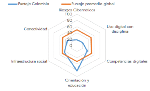 (iii) Competencias digitales, que mide si los niños poseen habilidades digitales que les permitan minimizar riesgos cibernéticos y ser buenos ciudadanos digitales, (iv) Orientación y educación, que mide si los niños cuentan con el apoyo de acudientes y de la educación escolar en respecto a seguridad en línea, (v) Infraestructura social, que mide si los gobiernos y la industria operan protegiendo a los niños de riesgos cibernéticos, y (vi) Conectividad, que mide si los niños pueden acceder a Internet con velocidades suficientes.