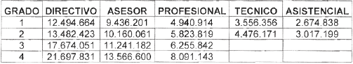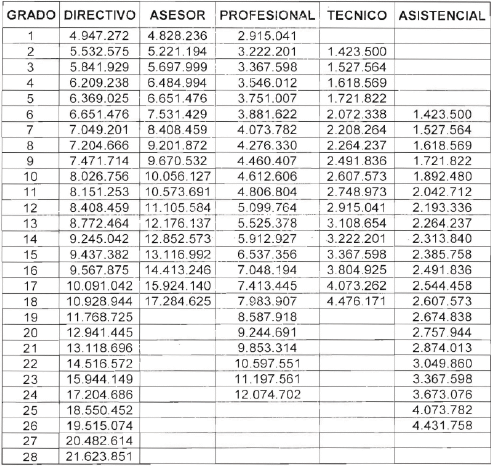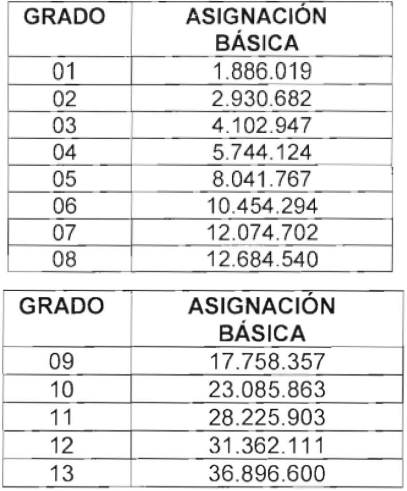 PARÁGRAFO 1o. En la escala de asignación básica fijada en el presente artículo la primera columna señala los grados de remuneración y la segunda indica la asignación básica mensual establecida para cada grado.