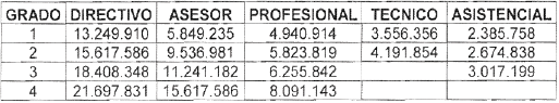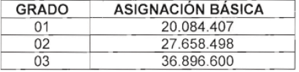 PARÁGRAFO 1o. En la escala de asignación básica fijada en el presente artículo, la primera columna señala los grados salariales correspondientes a las distintas denominaciones de empleos y la segunda columna indica la asignación básica mensual establecida para cada grado.