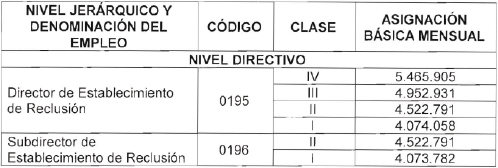 ARTÍCULO 30. ASIGNACIÓN BÁSICA DIRECTOR Y SUBDIRECTOR DE ESTABLECIMIENTO DE RECLUSIÓN. A partir del 1 de enero de 2025 fíjase la siguiente escala de asignaciones básicas mensuales para los empleos de Director y Subdirector de Establecimiento de Reclusión: