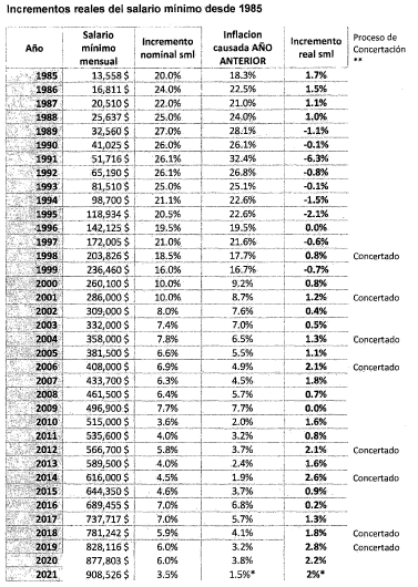 Que, con el fin de promover este objetivo plasmado en el Plan de Desarrollo, se ha fortalecido el ingreso real de los trabajadores remunerados con el salario mínimo de manera significativa, con incrementos por encima de la inflación superiores a los de años anteriores, como muestra el siguiente cuadro: