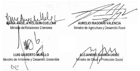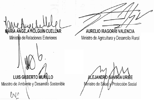Presentado al Honorable Congreso de la República por la Ministra de Relaciones Exteriores, el Ministro de Ambiente y Desarrollo Sostenible, el Ministro de Agricultura y Desarrollo Rural y el Ministro de Salud y Protección Social.