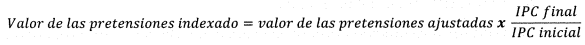 Con el fin de indexar el valor de las pretensiones de la demanda a la fecha actual, el/la apoderado/a debe dividir el IPC certificado por el DAÑE para el mes inmediatamente anterior a la fecha presente, entre el IPC certificado por el DAÑE para el mes en el cual se presentó la demanda. La cifra resultante se multiplica por el valor de las pretensiones que se pretende actualizar. El resultado es el valor indexado de las pretensiones de la demanda. La siguiente ecuación resume este procedimiento.