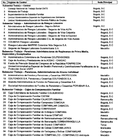 ARTÍCULO 14. CONTRALORÍA DELEGADA PARA EL SECTOR TRABAJO. <Resolución derogada por el artículo 32 de la Resolución REJ-EJE-0088 de 2021> La Contraloría Delegada para el Sector Trabajo será competente para ejercer la vigilancia y el control fiscal a los siguientes sujetos de control: