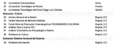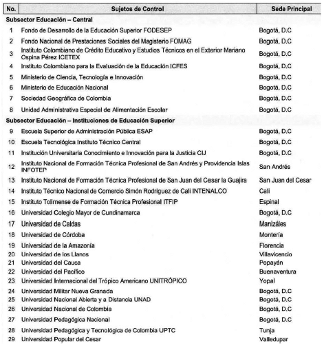 ARTÍCULO 6o. CONTRALORÍA PARA EL SECTOR EDUCACIÓN, CIENCIA Y TECNOLOGÍA, CULTURA, RECREACIÓN Y DEPORTE. <Resolución derogada por el artículo 33 de la Resolución REG-EJE-0095 de 2021> La Contraloría Delegada para el sector Educación, Ciencia y Tecnología, Cultura, Recreación y Deporte será competente para ejercer la vigilancia y el control fiscal a los siguientes sujetos de control: