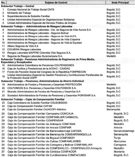 ARTÍCULO 14. CONTRALORÍA DELEGADA PARA EL SECTOR TRABAJO. <Resolución derogada por el artículo 33 de la Resolución REG-EJE-0095 de 2021> La Contraloría Delegada para el Sector Trabajo será competente para ejercer la vigilancia y el control fiscal a los siguientes sujetos de control: