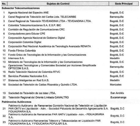 ARTÍCULO 4o. CONTRALORÍA PARA EL SECTOR DE TECNOLOGÍAS DE LA INFORMACIÓN Y LAS COMUNICACIONES. <Resolución derogada por el artículo 33 de la Resolución REG-EJE-0095 de 2021> La Contraloría Delegada para el Sector de Tecnologías de la Información y las Comunicaciones será competente para ejercer la vigilancia y el control fiscal a los siguientes sujetos de control: