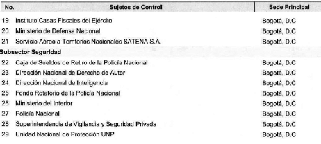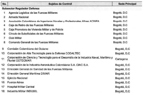 ARTÍCULO 5o. CONTRALORÍA PARA EL SECTOR DEFENSA Y SEGURIDAD. <Resolución derogada por el artículo 33 de la Resolución REG-EJE-0095 de 2021> La Contraloría Delegada para el Sector Defensa y Seguridad será competente para ejercer la vigilancia y el control fiscal a los siguientes sujetos de control: