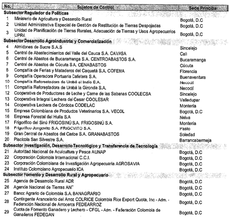 ARTÍCULO 2o. CONTRALORÍA DELEGADA PARA EL SECTOR AGROPECUARIO. <Resolución derogada por el artículo 33 de la Resolución REG-EJE-0097 de 2021> La Contraloría Delegada para el Sector Agropecuario, será competente para ejercer vigilancia y control fiscal a los siguientes sujetos de control: