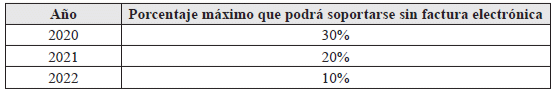 PARÁGRAFO TRANSITORIO 1o. Los requisitos, condiciones y procedimientos establecidos en el presente artículo, serán reglamentados por el Gobierno nacional; entre tanto aplicarán las disposiciones que regulan la materia antes de la entrada en vigencia de la presente ley. Las facturas expedidas de conformidad con los artículos 1.6.1.4.1.1 al 1.6.1.4.1.21. del Decreto número 1625 de 2016 mantienen su condición de documentos equivalentes. A partir del 1 de enero de 2020, se requerirá factura electrónica para la procedencia de impuestos descontables, y costos o gastos deducibles, de conformidad con la siguiente tabla: