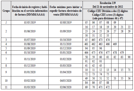 a) Grupo: Corresponde al orden en que los sujetos obligados a expedir factura electrónica de venta, deben cumplir con las fechas indicadas para la fase de registro y habilitación en el servicio informático electrónico de validación previa de factura electrónica y expedición de la misma.