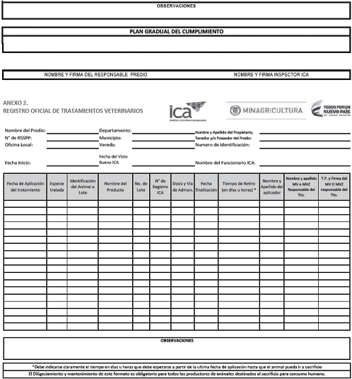 9.11. Llevar el Registro Oficial de los Tratamientos Veterinarios realizados en el predio, indicando: fecha de inicio del tratamiento, nombre del producto, número del registro ICA, número de lote del producto, dosis administrada, vía de administración, especie e identificación individual del animal o lote de animales tratados, fecha de finalización del tratamiento, nombre y apellido del aplicador del tratamiento, tiempo de retiro (en días u horas), nombre, apellido, número de matrícula profesional vigente y firma del médico veterinario o médico veterinario zootecnista que prescribió el tratamiento, para los tratamientos de los productos veterinarios que así lo requieran. Este registro se debe diligenciar conforme al Anexo número 2 de la presente resolución, puede tener forma física o digital y el visto bueno del funcionario del ICA o aquel que el ICA haya delegado o autorizado, que realice la visita técnica de autorización. Debe tener un antecedente o historial de mínimo tres (3) meses. En aquellos predios en los que se lleve un registro de los tratamientos en un formato diferente al establecido en el Anexo número 2 de la presente Resolución, se podrá homologar el mismo, siempre y cuando contenga como mínimo los requisitos establecidos en el presente numeral y cuente con la revisión y visto bueno del funcionario ICA o aquel que el ICA haya delegado o autorizado y que realice la visita técnica de autorización.