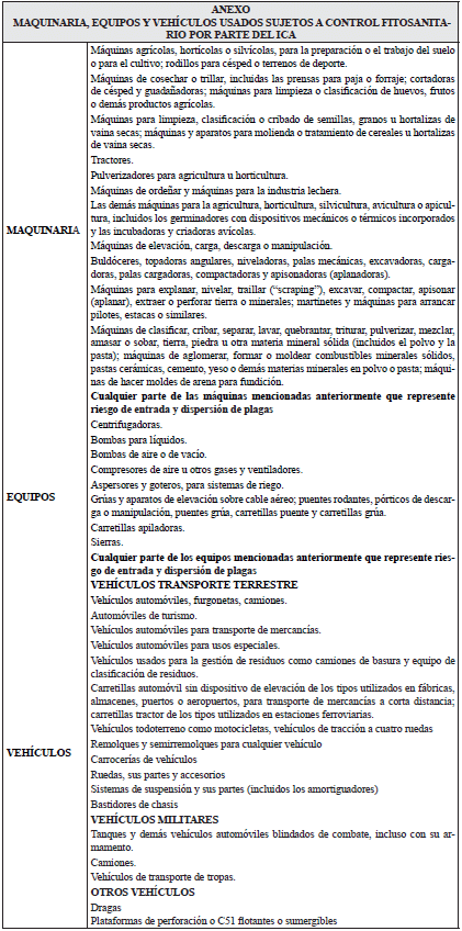 ARTÍCULO 9o. ANEXO. Hace parte integral de la presente resolución el anexo: “MAQUINARIA, EQUIPOS Y VEHICULOS USADOS SUJETOS A CONTROL FITOSANITARIO POR PARTE DEL ICA”