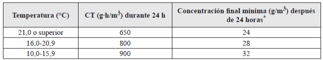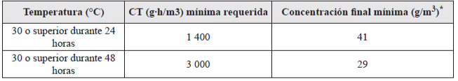 Cuadro 2. CT mínima durante 24 o 48 horas para el embalaje de madera fumigado con fluoruro de sulfurilo: