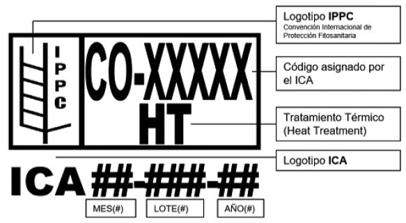 Fuera del sello NIMF 15, el operador autorizado para la aplicación del tratamiento de embalaje de madera incluirá el logotipo del ICA, número consecutivo del tratamiento, el cual tendrá cinco (5) dígitos: los dos primeros para el mes (mm) y los tres restantes para el número consecutivo del lote de ese mes (###). Seguidamente se incluirán dos dígitos para el año de realización (aa), tal y como se ilustra en el siguiente ejemplo:
