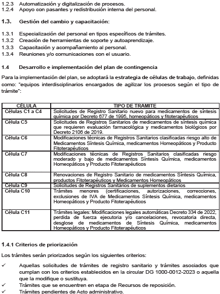 Que, de acuerdo con lo expuesto, la Dirección General y la Dirección de Medicamentos y Productos Biológicos del Instituto Nacional de Vigilancia de Medicamentos y Alimentos (Invima), en aras de dar respuesta a los trámites radicados ante el Instituto y garantizar la seguridad sanitaria en los medicamentos y productos biológicos en el país, denota la necesidad de establecer y adoptar un Plan de Contingencia que le permita al Instituto, evaluar de manera eficiente, agilizando las decisiones que corresponda y en consecuencia las actuaciones administrativas se cumplan en el menor tiempo posible.