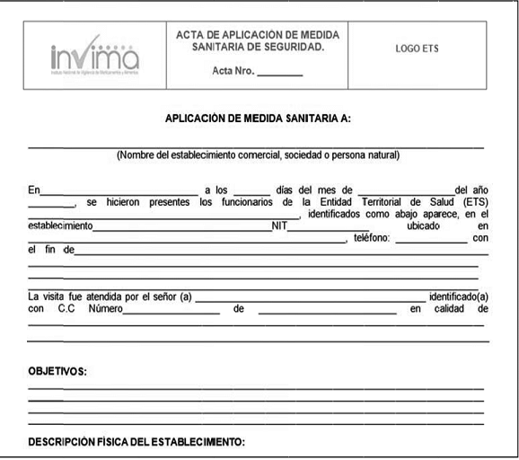 Para la aplicación de una MSS se diligenciará el ACTA DE APLICACIÓN DE MEDIDA SANITARIA DE SEGURIDAD, de acuerdo a lo definido en la página 55 del “Manual inspección vigilancia y control sanitario de alimentos y bebidas basado en riesgo para las entidades territoriales de salud” (Documento número 25 del presente anexo técnico).