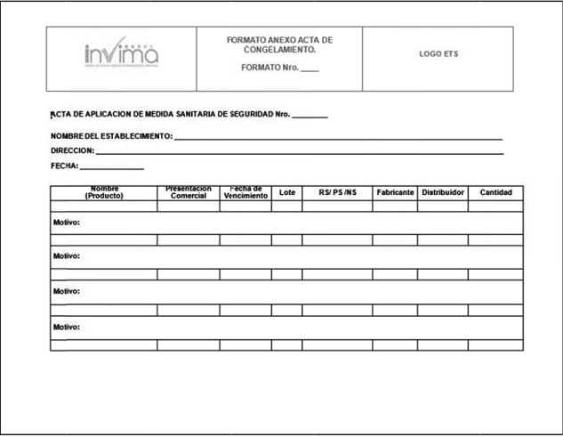 Cuando la MSS consiste en congelación, se diligencia adicionalmente el Formato anexo acta de congelamiento, de acuerdo a lo establecido en la Figura 21 del “Manual inspección vigilancia y control sanitario de alimentos y bebidas basado en riesgo para las entidades territoriales de salud” (Documento número 25 del presente anexo técnico).