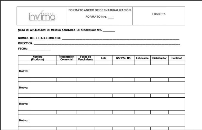 Cuando la MSS consiste en desnaturalización se diligencia adicionalmente el Formato anexo a desnaturalización, de acuerdo a lo establecido en la Figura 23 del “Manual inspección vigilancia y control sanitario de alimentos y bebidas basado en riesgo para las entidades territoriales de salud” (Documento número 25 del presente anexo técnico).