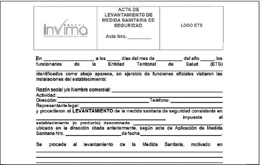 Para el levantamiento de una MSS se diligencia el ACTA DE LEVANTAMIENTO DE MEDIDA SANITARIA DE SEGURIDAD, de acuerdo a lo establecido en la página 59 del “Manual inspección vigilancia y control sanitario de alimentos y bebidas basado en riesgo para las entidades territoriales de salud” (Documento número 25 del presente anexo técnico).