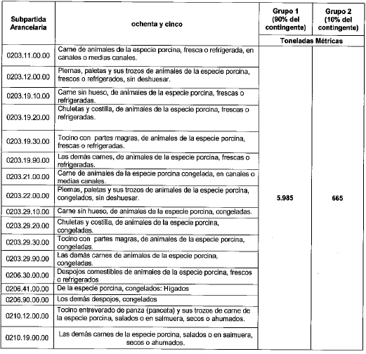 Que el artículo 50 del Decreto No. 185 de 2012, estableció un contingente arancelario de importación para carne de porcino, clasificadas por las subpartidas arancelarias 0203.11.00.00, 0203.12.00.00, 0203.19.00.00, 0203.21.00.00, 0203.22.00.00, 0203.29.00.00, 0206.30.00.00, 0206.41.00.00, 0206.90.00.00^ 0210.12.00.00 y 0210.19.00.00, originarias de Canadá.