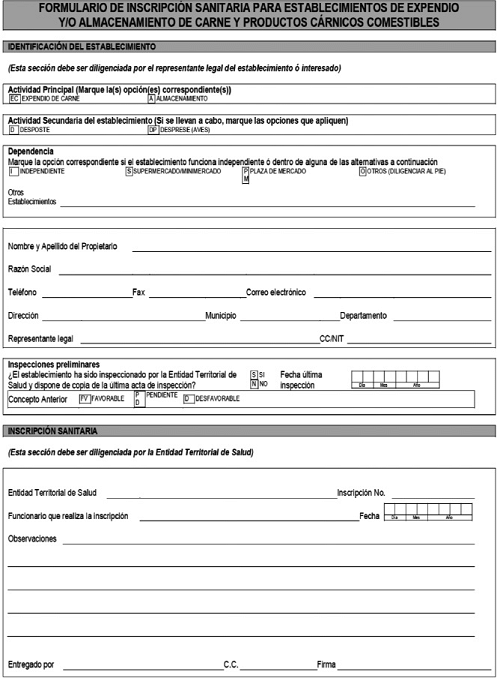 FORMULARIO DE INSCRIPCIÓN SANITARIA PARA ESTABLECIMIENTOS DE EXPENDIO Y/O ALMACENAMIENTO DE CARNE Y PRODUCTOS CÁRNICOS COMESTIBLES