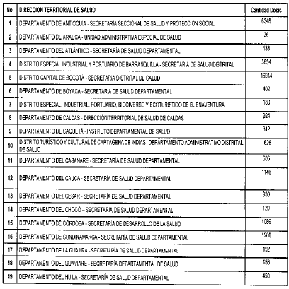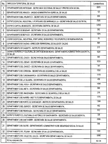Artículo 2o. Asignación de vacuna para garantizar la segunda dosis al personal que recibió la primera dosis producto de la distribución realizada mediante Resolución número 168 del 16 de febrero de 2021. Asignar 49.134 dosis de la vacuna contra el Covid-19 entregadas por el Fabricante Pfizer Inc y BioNTech el 3 de marzo de 2021, a los departamentos y distritos que se señalan a continuación, las cuales deben ser aplicadas al talento humano que fue beneficiado por las vacunas distribuidas en el marco de la Resolución número 168 de 2021: