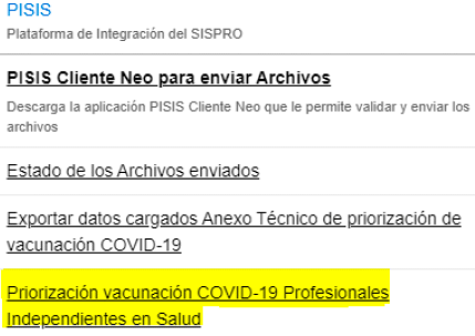 Los prestadores de servicios de salud inscritos como profesionales independientes en el Registro Especial de Prestadores de Salud (REPS), reportarán la información del talento humano en salud, y el personal de apoyo logístico y administrativo, en los casos que aplique, para la priorización de la población para la vacunación contra el COVID-19 a partir del formulario electrónico dispuesto por el Ministerio de Salud y Protección Social en https://web.sispro.gov.co/, en el enlace resaltado: