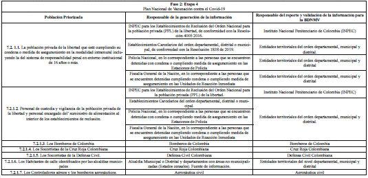 Que, la citada norma establece que, el Plan Nacional de Vacunación está integrado por 2 fases y 5 etapas, y que este Ministerio será el encargado de identificar las personas a vacunar en cada etapa, así como de conformar gradualmente la Base de Datos Maestra de Vacunación Nominal, de acuerdo con la información contenida en las bases de datos oficiales con las que cuenta el Estado colombiano y aquellas que estén disponibles; así mismo dispuso que para la identificación nominal de algunos grupos poblacionales priorizados de los cuales el Ministerio no disponga de información, este solicitará a las entidades públicas o privadas la entrega de la información correspondiente, mediante los mecanismos electrónicos que defina, precisando que la completitud, oportunidad y calidad de los datos suministrados por esas entidades será responsabilidad de las mismas, quienes deberán disponer de un mecanismo de consulta para que la población pueda solicitar la revisión de su caso, si lo considera necesario.