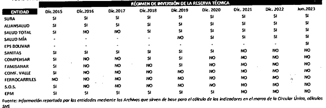 Que, la Superintendencia Nacional de Salud, dentro del marco de sus funciones, emite informes periódicos con la finalidad de verificar el cumplimiento de los requisitos financieros de habilitación y permanencia de las Entidades Promotoras de salud; de acuerdo a ello, la entidad de vigilancia para el sector salud profirió informe denominado “Evaluación del cumplimiento de los indicadores de capital mínimo, patrimonio adecuado y régimen de inversión de reserva técnica-junio 2023", el cual refleja el histórico de cumplimiento (incumplimiento) de la condición financiera de régimen de inversiones de reservas técnicas de la temporalidad de diciembre 2015 hasta junio 2023 de las promotoras de salud, arrojando los siguientes resultados;