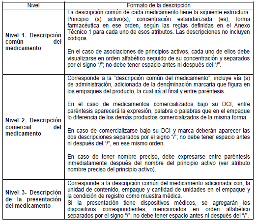 ARTÍCULO 5o. NIVELES DE DESCRIPCIÓN DEL MEDICAMENTO. Para efectos del estándar de datos, el medicamento se describe en tres niveles: Nivel 1. Medicamento en su descripción común; Nivel 2. Medicamento comercial y Nivel 3. Medicamento con presentación comercial, de acuerdo con el Anexo Técnico 3 “Formato de la Descripción de los niveles del estándar de datos” el cual hace parte integral de la presente resolución.