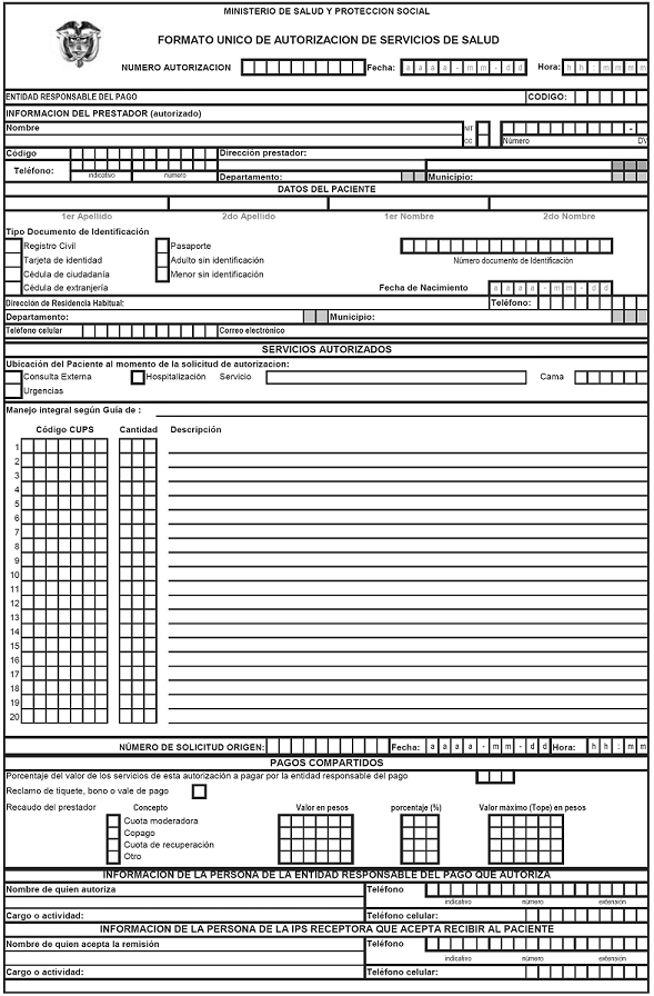 Mediante el presente formato se estandariza el contenido de la información que debe diligenciar la entidad responsable del pago al prestador de servicios de salud cuando emite una autorización, si no se tiene acuerdo de voluntades, o si en el acuerdo de voluntades se tiene establecido como requisito, sea ella para prestar servicios posteriores a la atención inicial de urgencias, ampliar una autorización previamente emitida, o para autorizar servicios electivos, sean ellos de carácter hospitalario o ambulatorio. Debe ser diligenciado por el funcionario designado por la entidad responsable del pago, dentro de los términos definidos en los artículos 5o y 7o de la presente resolución.