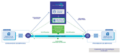 Los servidores de seguridad se comunican entre sí utilizando servicios REST y SOAP. Los servicios REST no requieren ajustes para ser implementados. Por el contrario, los servicios SOAP requieren de ajustes en sus cabeceras para cumplir con el protocolo de mensajes X- Road para SOAP. A su vez, cada servidor de seguridad establece comunicación directa con los servicios de confianza (CA y Autoridad de Estampa de Tiempo).