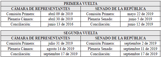 El proyecto de Acto Legislativo en mención fue debatido y aprobado por el Congreso de la República en las siguientes fechas: