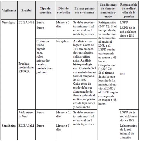 2.1.3 En todos los casos probables de mortalidad por dengue, la UPGD debe tomar muestras de suero y tejido (hígado, bazo, riñón, miocardio, cerebro y médula ósea), enviar al LSPD para su remisión al INS. Estas muestras puede ser tomadas por vicerotomía.