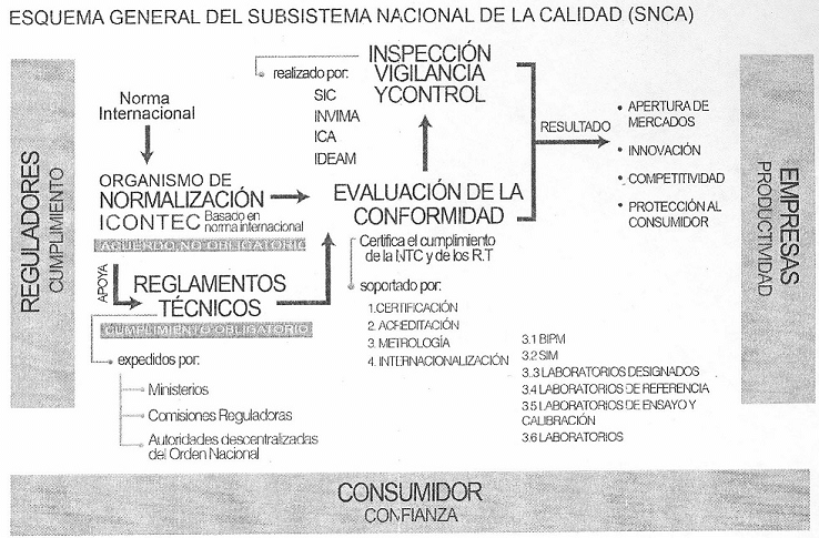 Que el Conpes 3446 de 2006 determinó los lineamientos para una política nacional de la calidad tendiente al reconocimiento internacional, a través de la reorganización de la institucionalidad existente en esta materia y del fortalecimiento de las actividades de normalización, acreditación, evaluación de la conformidad, expedición de reglamentos técnicos y metrología. Así, el Subsistema Nacional de la Calidad constituye actualmente un componente fundamental para el efectivo aprovechamiento de los tratados de comercio vigentes, toda vez que permite la inserción de productos colombianos al mercado global, a través del establecimiento de normas y reglamentos técnicos adaptados conforme a las tendencias internacionales.