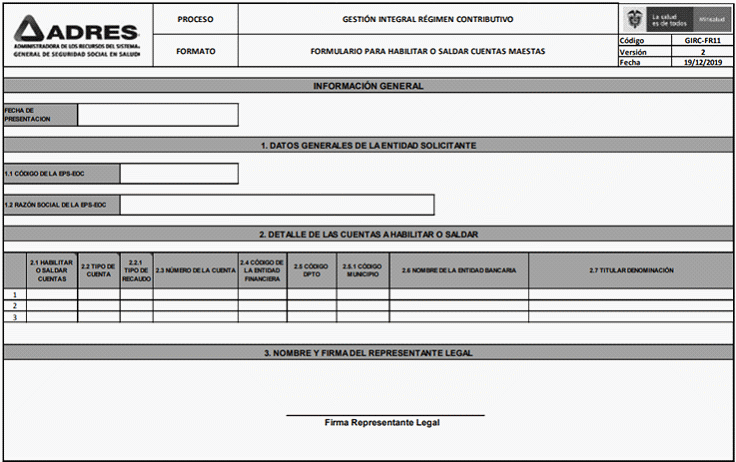 1. Anexo técnico 1. Formulario para habilitar o saldar cuentas maestras de recaudo y pagos. Contiene el formulario que debe ser remitido por la EPS – EOC, para registrar o actualizar los datos de las cuentas maestras del régimen contributivo en el sistema de información de la ADRES.