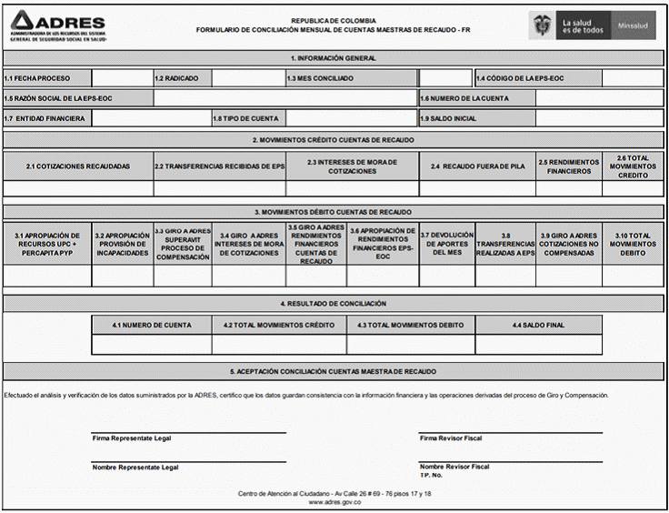 4. Anexo técnico 4. Formulario de resultado de conciliación de cuentas maestras de recaudo. Contiene el formulario publicado por la ADRES, resultado del proceso de conciliación de cuentas maestras, el cual incluye la información del recaudo, intereses de mora de cotizaciones, las transferencias recibidas y realizadas por la EPS, el proceso de compensación, el proceso de devolución de aportes, los rendimientos financieros y las cotizaciones no compensadas en el periodo de acuerdo con lo establecido en el Decreto número 780 de 2016.