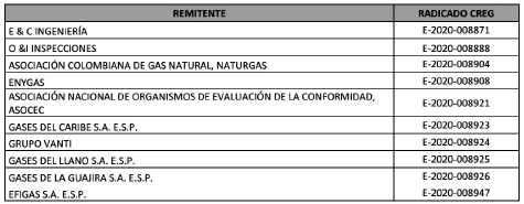 Respecto del proyecto de resolución publicado, se recibieron comentarios, tanto de usuarios, como de empresas distribuidoras de gas combustible por redes de tubería, las asociaciones que las agrupan y de Organismos de Inspección Acreditados (OIA) y la asociación que los agrupa, mediante las comunicaciones que se relacionan a continuación: