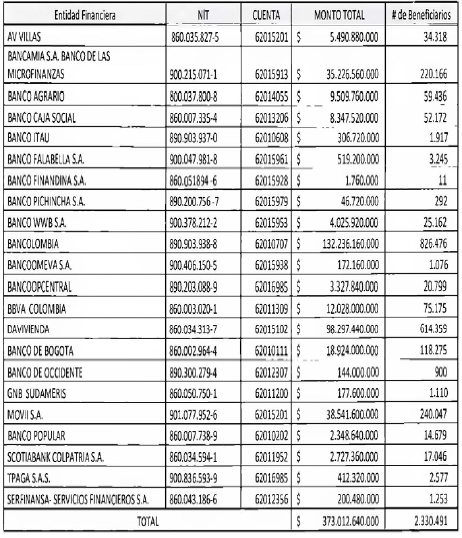 PARÁGRAFO 1o. Los recursos serán consignados en la cuenta de depósito (CUD) del Banco de la República que la entidad financiera indicó de acuerdo con la anterior tabla.
